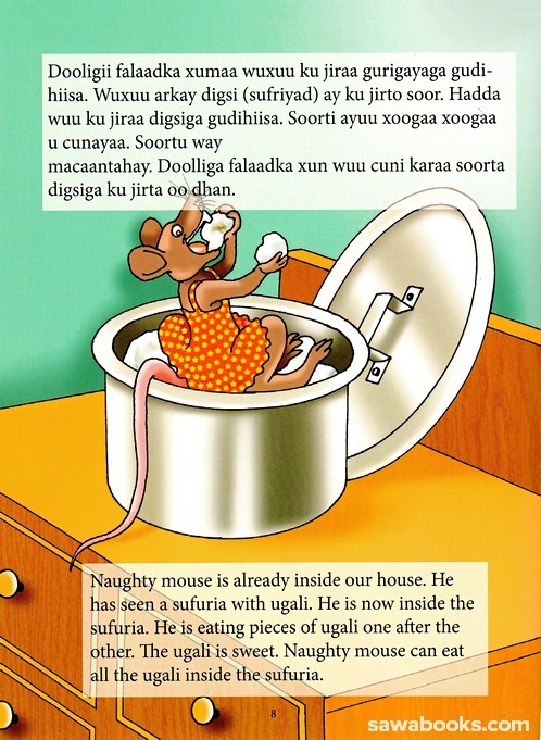 The family cat tries to outsmart and catch a mischievous mouse. Bilingual in Somali and English.